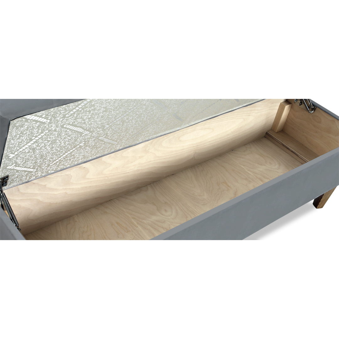 Die Sitzfläche der Bank ist ein aufklappbarer Deckel aus Spanplatten mit Federscharnieren. Unter dem Sitz befindet sich ein Bettkasten mit den Maßen 350x1250x210 mm, der Bodenteil ist aus 4 mm Sperrholz gefertigt.