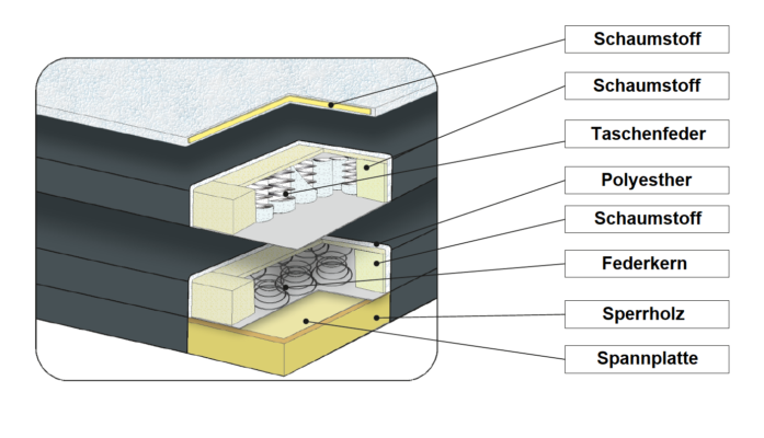 Polsterung: Holzgestell mit Sperrholz und Spannplatte, Federkern “Bonell”, Schaumstoff, Taschenfederkern “Pocket Spring”