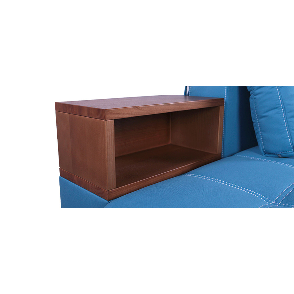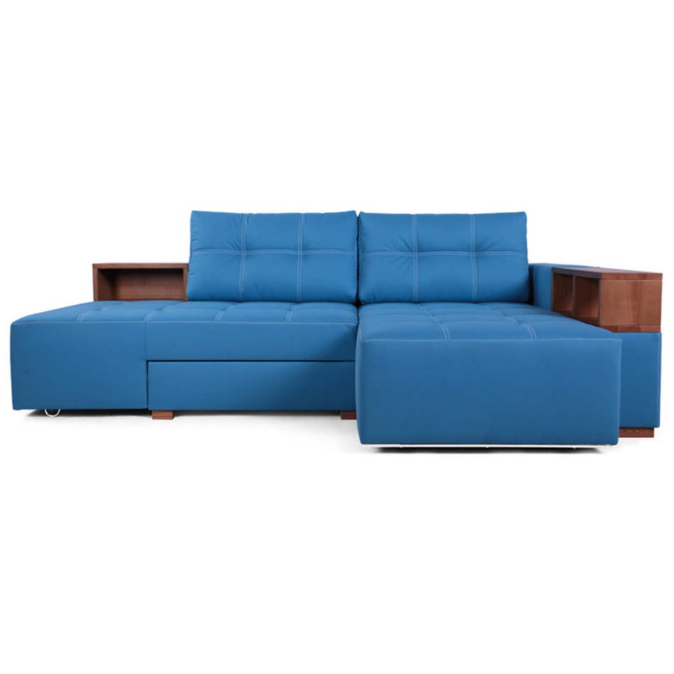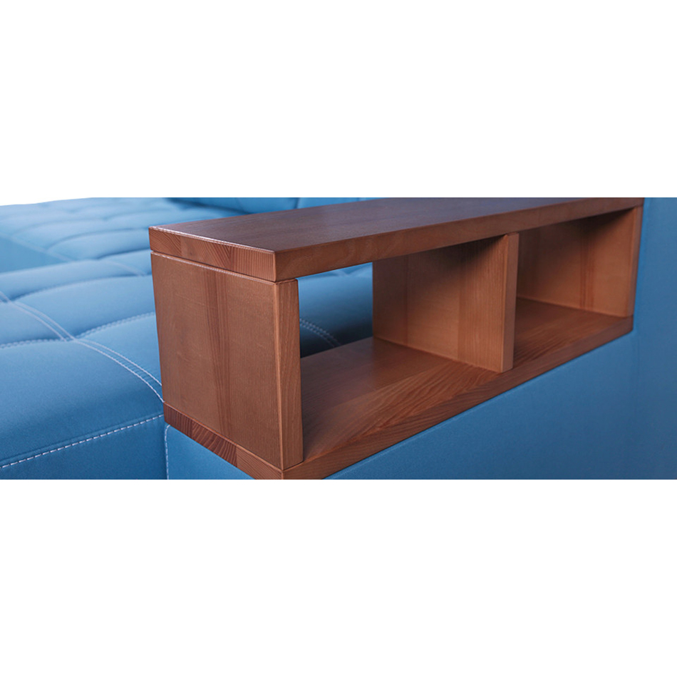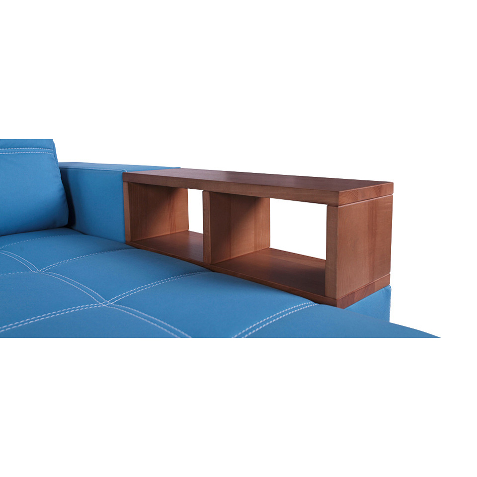 Das Sofa ist ein multifunktionales Modell und es sind Regale oder Nachttische bereits integriert. Wobei die Regale oder Nachtkästchen aus Hartholz bestehen, Sie können aber auch laminiertes Sperrholz bekommen. Der Rahmen des Ecksofas ist aus Nadelholz gefertigt. Die Füße dieses Sofa sind aus massiver Esche.