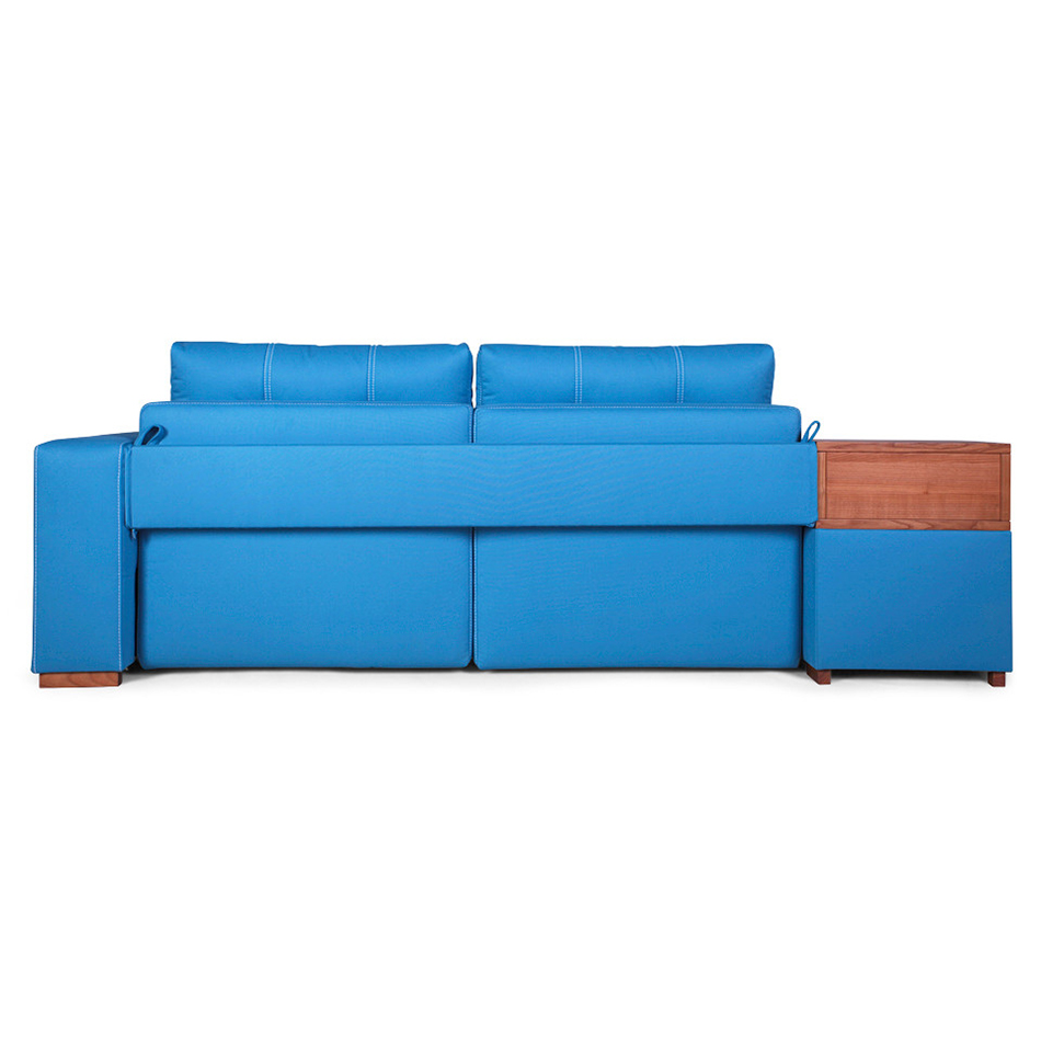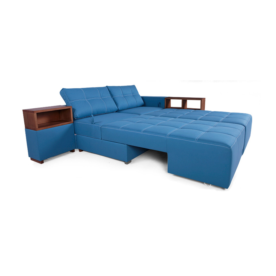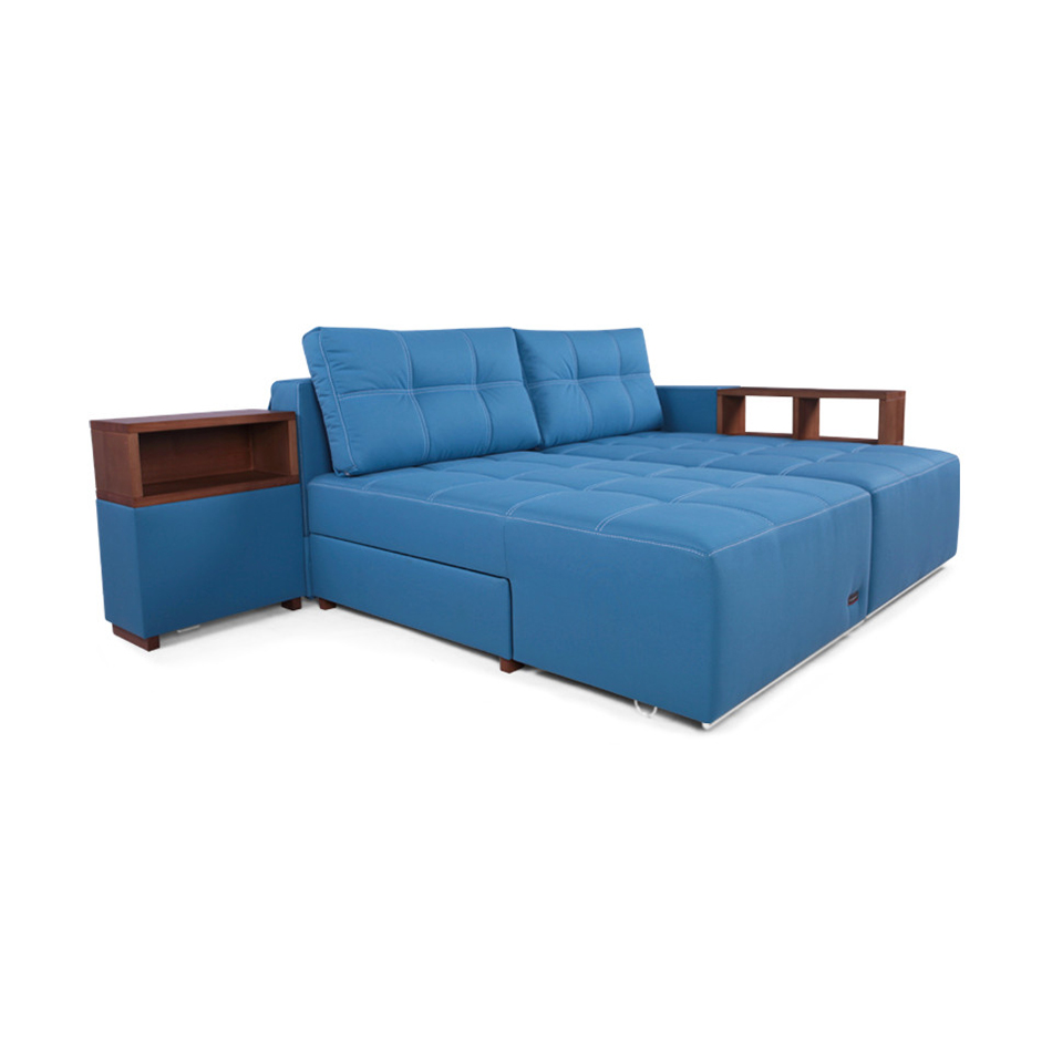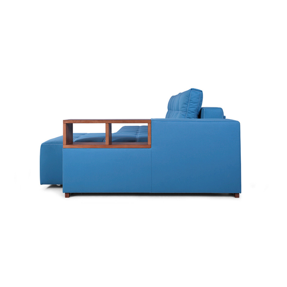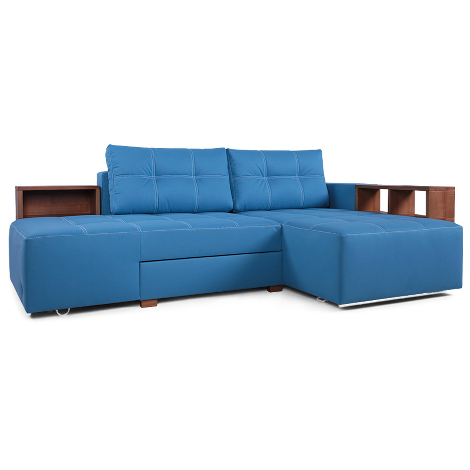 Das Sofa ist ein multifunktionales Modell und es sind Regale oder Nachttische bereits integriert. Wobei die Regale oder Nachtkästchen aus Hartholz bestehen, Sie können aber auch laminiertes Sperrholz bekommen. Der Rahmen des Ecksofas ist aus Nadelholz gefertigt. Die Füße dieses Sofa sind aus massiver Esche.