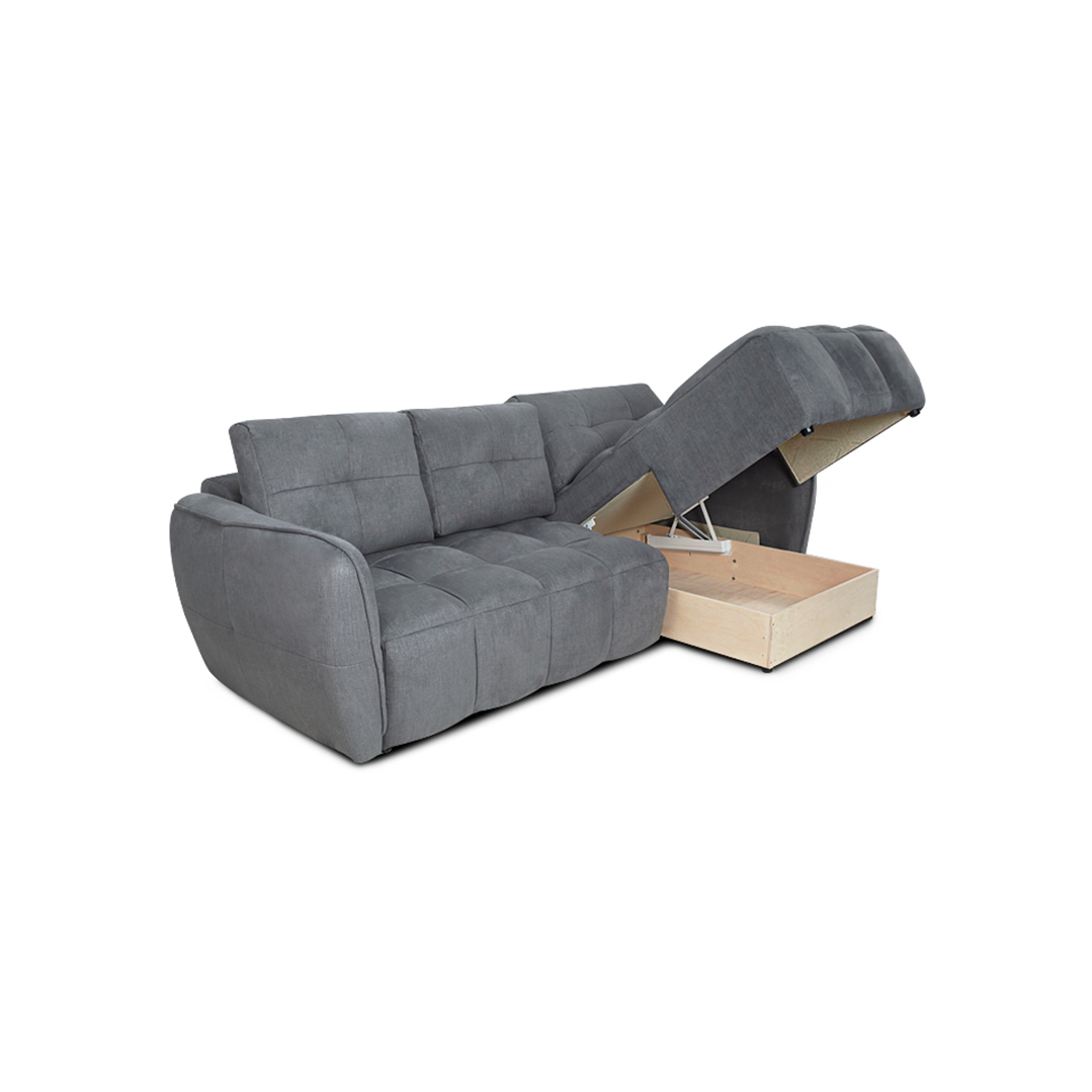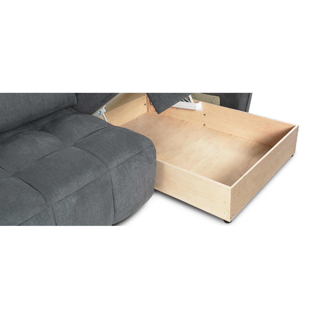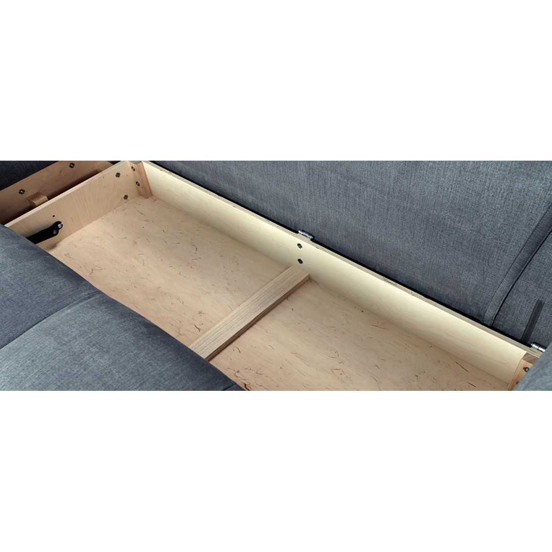 Ecksofa Joker 2er breit mit Schlaffunktion, kleinem Bettkasten im Sitzer sowie großem bei der Ottomane (jeweils aus massiven Holzteilen).