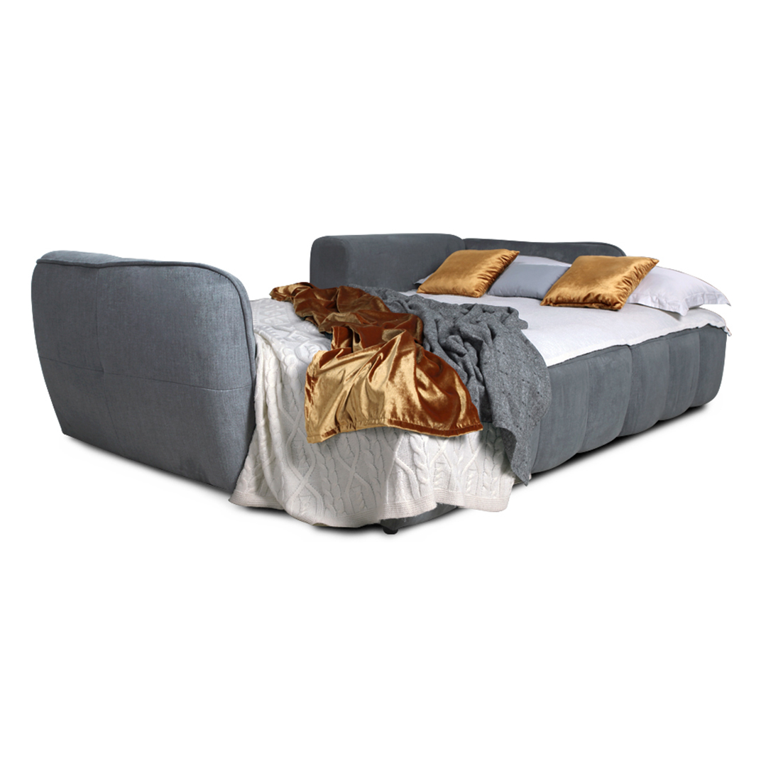 Zum beeindruckenden Erscheinungsbild dieses Modells trägt auch die Verarbeitung der Polstersitzbezüge zu Zellen bei, was an kuschelig weiche Daunenduvets erinnert und buchstäblich dazu einlädt, sich darauf hinzulegen. Abschlussnähte und Zierstiche der Polstermöbelbezüge sind in der Farbe des Grundmaterials gehalten und die Kissenbezüge sind abnehmbar.