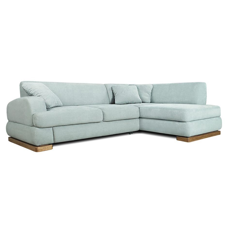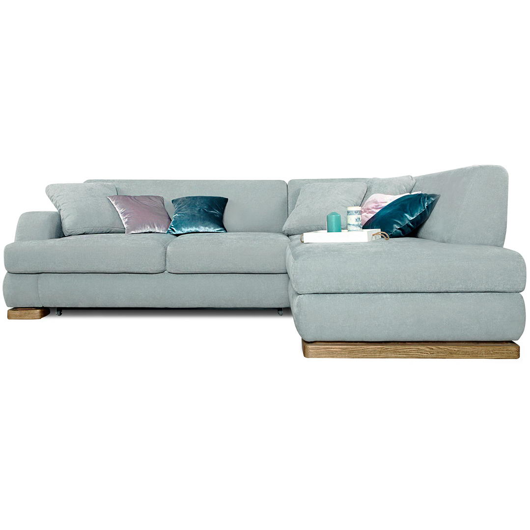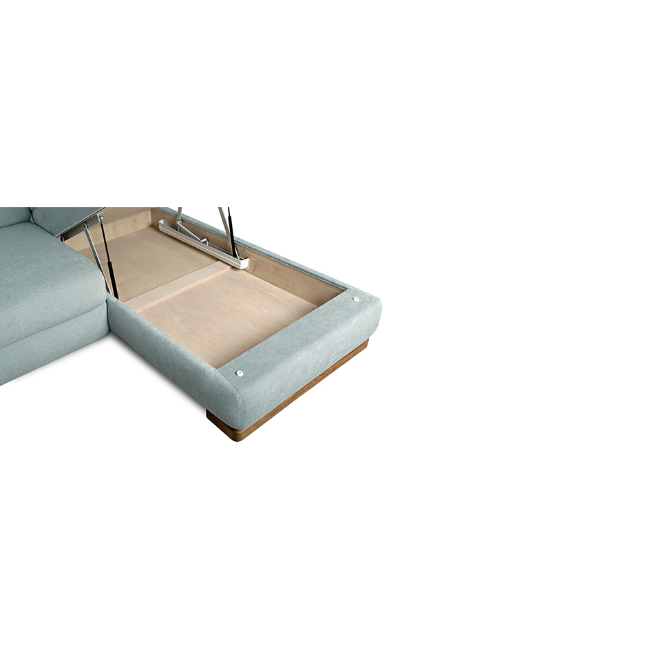 Verwandlungsmechanismus: «Delphin». Um die Liegefläche aufzuklappen, müssen Sie den beweglichen Teil des Schlafabschnittes bis zum Anschlag nach vorne schieben. Ziehen Sie den Mechanismus mit der Hilfe des Hebebandes nach oben und weg. Der Hebemechanismus der Liege ist durch ein Kunststoffgehäuse geschützt. Die Größe der Liegefläche des Eckecksofa ist 154x209cm. Die Tragfähigkeit beträgt 160 kg.