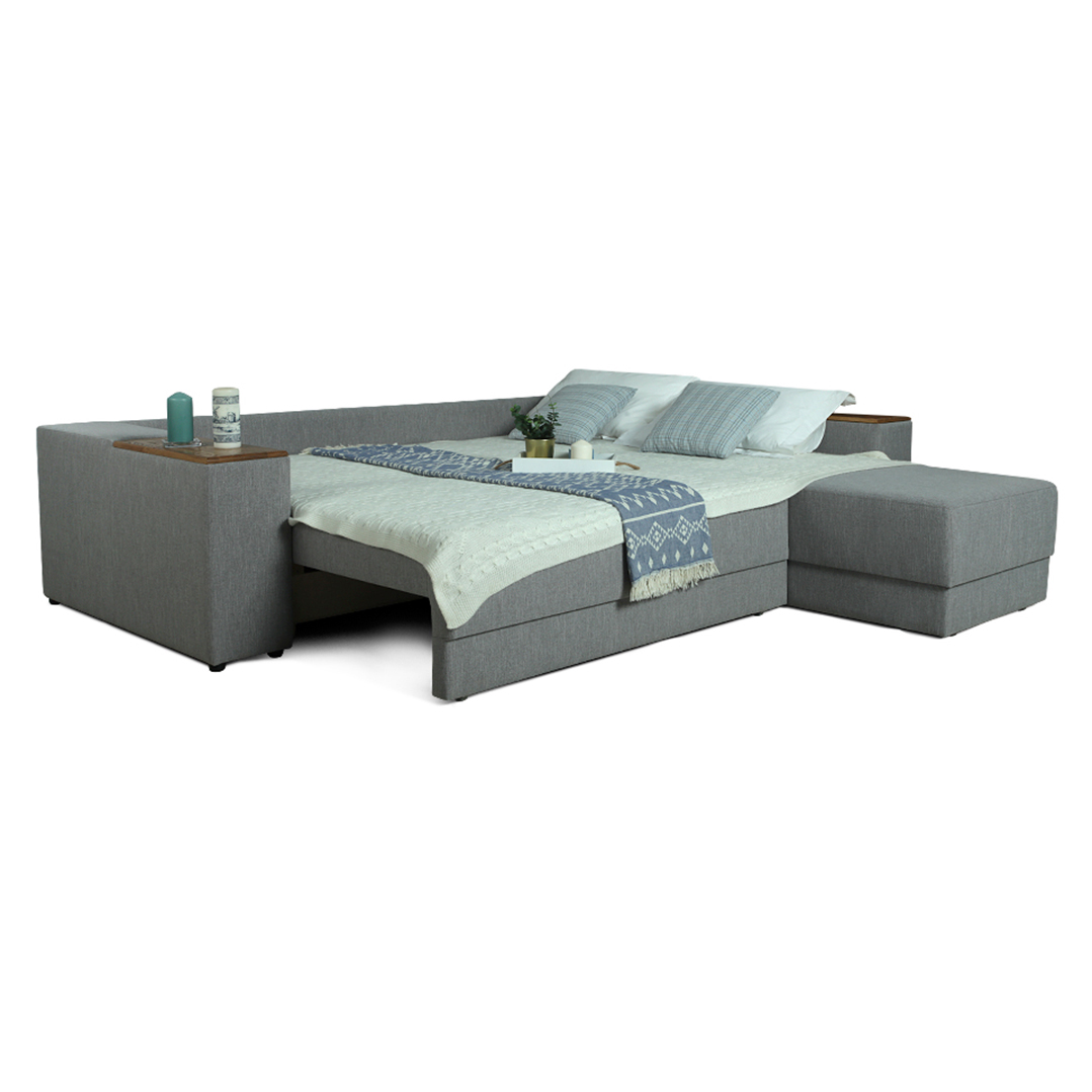 Das Ecksofa „Prestige“ vereint modernes Design mit Funktionalität. In nur wenigen Schritten kann das schicke Sofa zum Schlafsofa umgebaut werden. Der Rahmen ist aus hochwertigem Birkensperrholz hergestellt, dass für Stabilität sorgt. Die praktischen Wäschekisten in der Sitzfläche schaffen einen Stauraum.