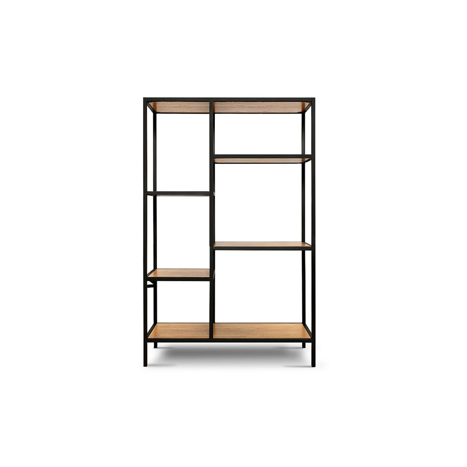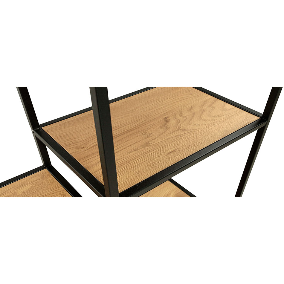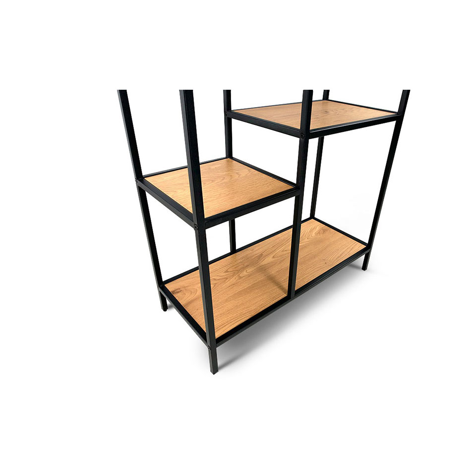 Das Regal ist für Innenräume zu Hause ausgelegt. Es ist eine nicht trennbare Metallstruktur in zwei Versionen: groß und klein. Der Rahmen besteht aus einem Metallprofilrohr mit einem Querschnitt von 15 x 15 mm. Die Farbe der geformten Röhre ist schwarz. Die Regale bestehen aus furniertem MDF. Die Einbauhöhe des Regals ist nicht einstellbar. Die Farbe des Furniers ist Richmond.