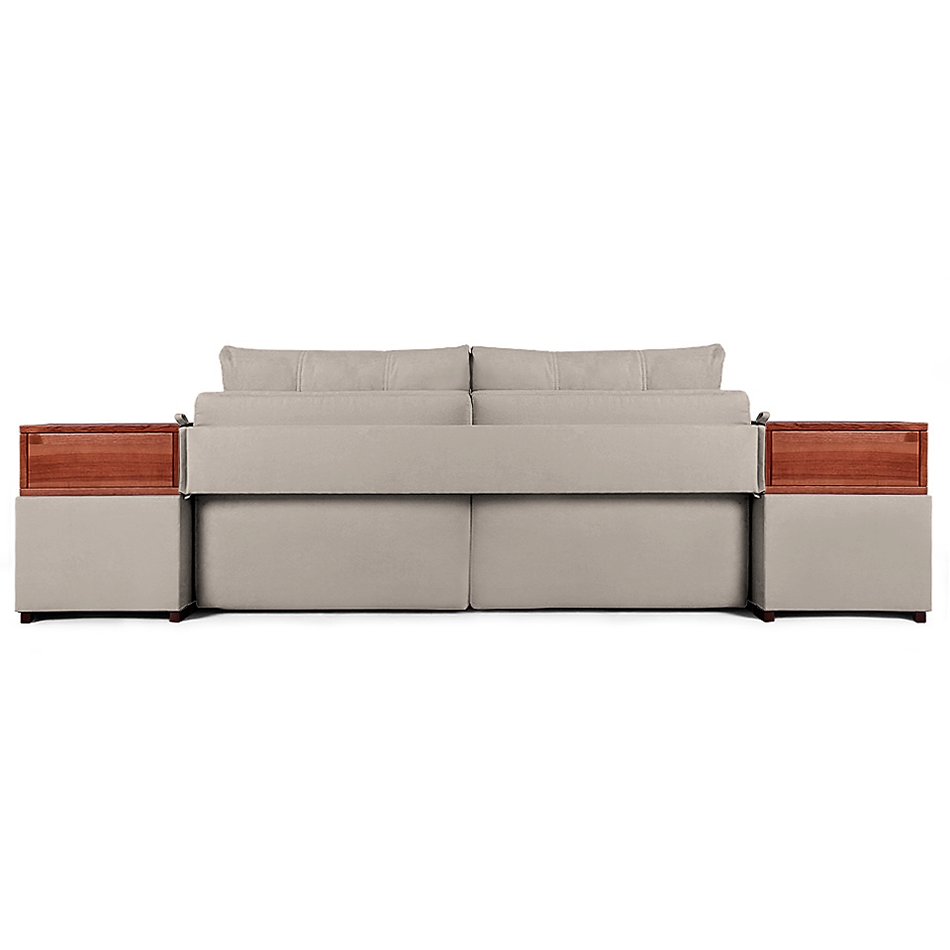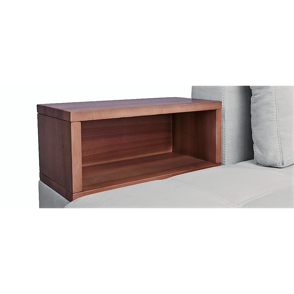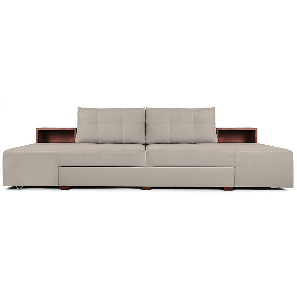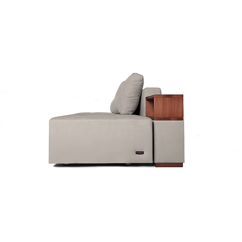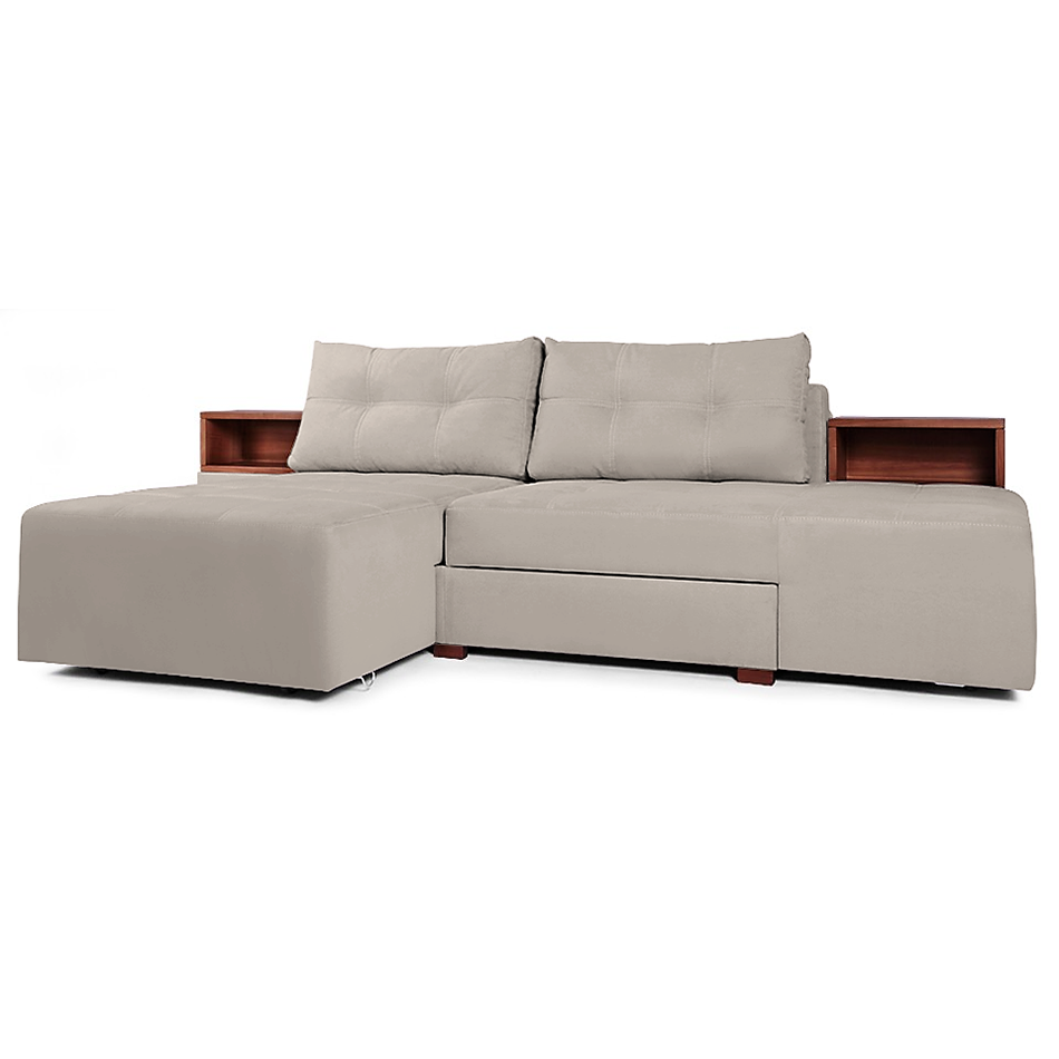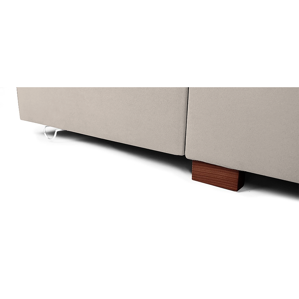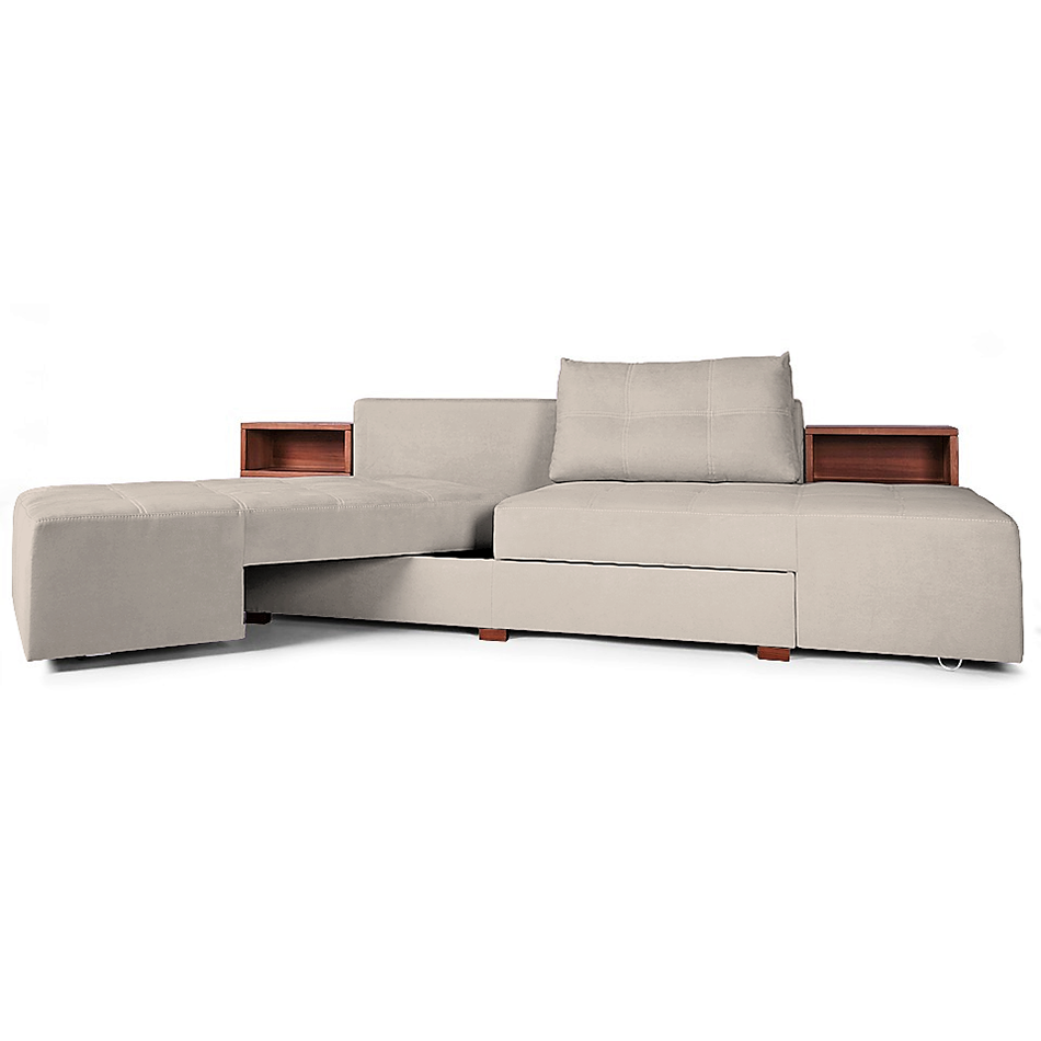 Das Sofa ist ein multifunktionales Modell und es sind Regale oder Nachttische bereits integriert. Wobei die Regale oder Nachtkästchen aus Hartholz bestehen, Sie können aber auch laminiertes Sperrholz bekommen. Der Rahmen des Ecksofas ist aus Nadelholz gefertigt. Die Füße dieses Sofa sind aus massiver Esche.