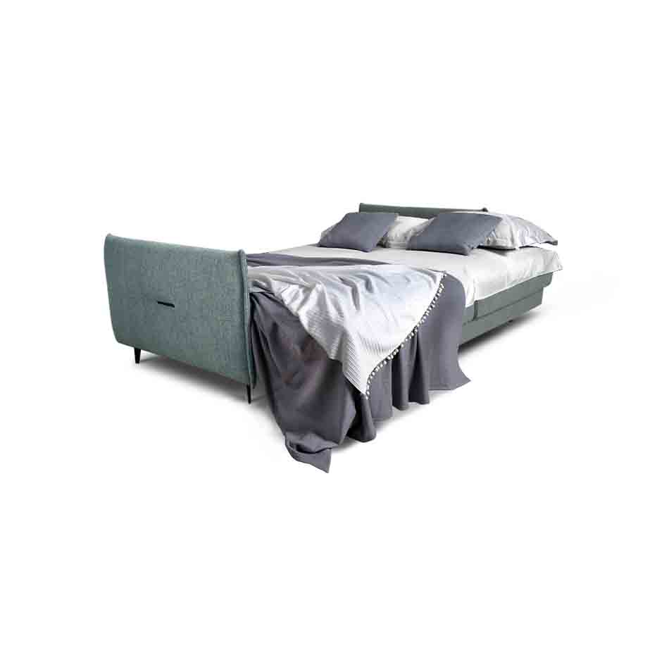 Das Sofa ist mit einem komfortablen Pantograph-Transformationssystem ausgestattet, das für den täglichen Schlaf geeignet ist. Die Sitzfläche bewegt sich durch einen speziellen Scharniermechanismus entlang eines Bogens nach vorne mit automatischer Öffnung der zusätzlichen Sattelstütze, die Rückenlehne des Sofas wird horizontal auf die freigewordene Fläche abgesenkt.